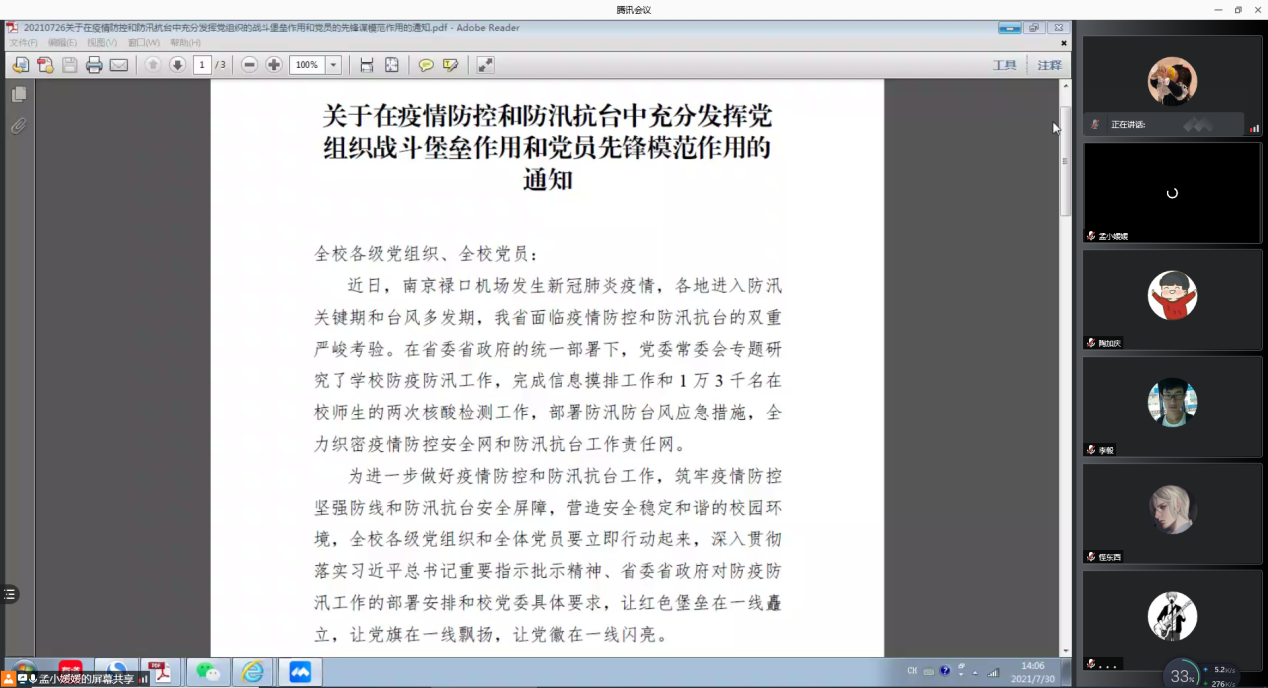 2021年7月30日下午14时,太阳成集团tyc122ccvip市政研究生党支部开展专题会议,组织共同深入学习《关于在疫情防控和防汛抗台中充分发挥党组织战斗堡垒作用和党员先锋模范作用的通知》。