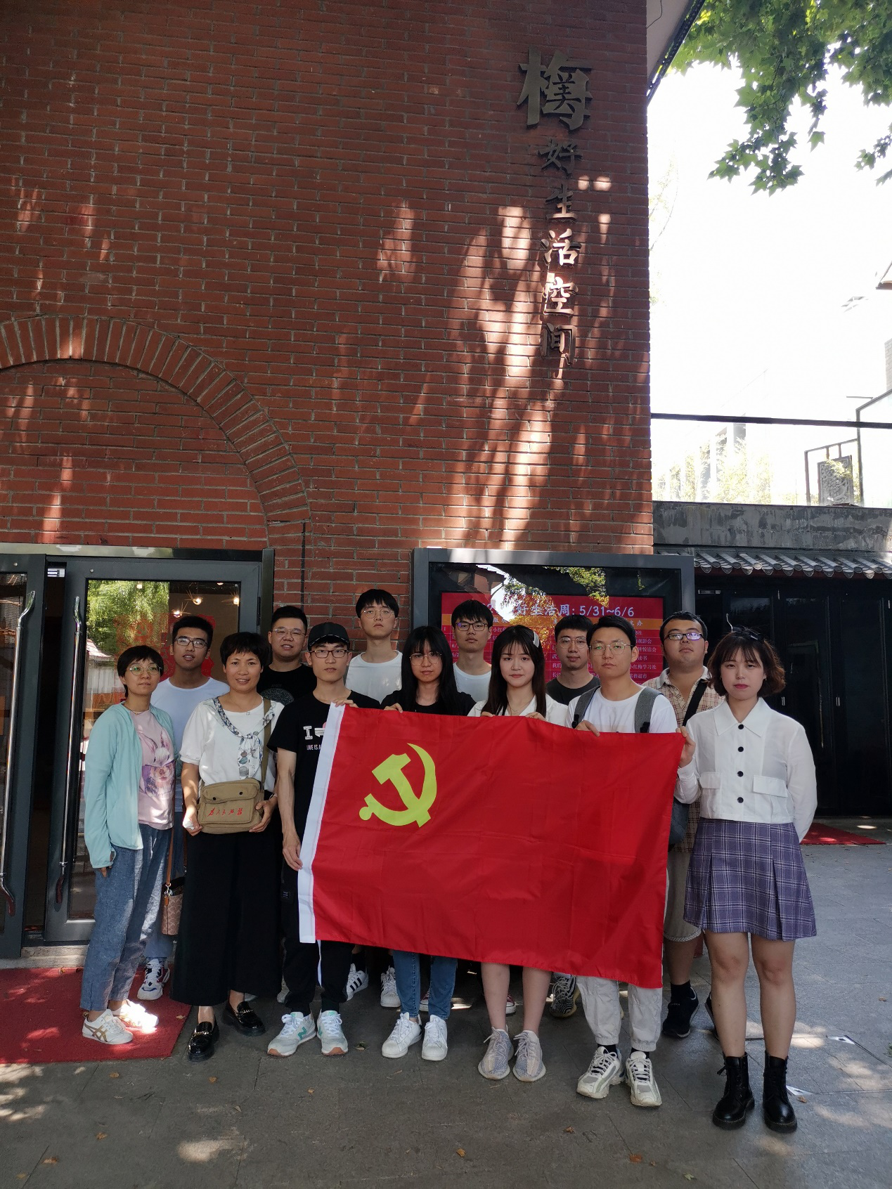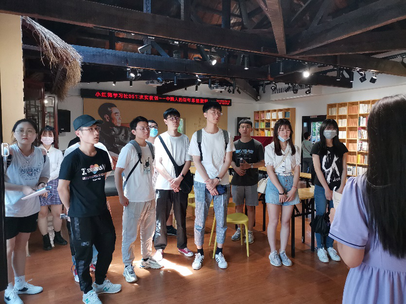 到达目的后,大家都被这个党员活动基地的优雅环境所吸引。在室外,衔接二楼楼梯的是爬满青藤的咖啡座椅,在韶音馆是满墙满墙的书,和别致的古筝演奏室。志愿讲解员的带领下,大家依次参观了 “践行梅园”、“梅好客厅”、“韶音馆”、“梅好车间”等实境青年堂,观摩周恩来信仰人生践行展、人民共和的起源浮雕影像展、时代之声歌曲展。