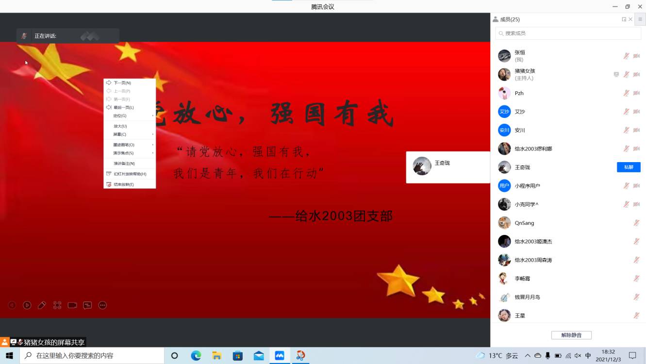 为深入学习贯彻习近平总书记“七一”重要讲话精神的重大意义和丰富内涵,太阳成集团tyc122ccvip给水2003班团支部于2021年12月3日晚组织开展了“请党放心,强国有我,我们是青年,我们在行动”主题团日活动。