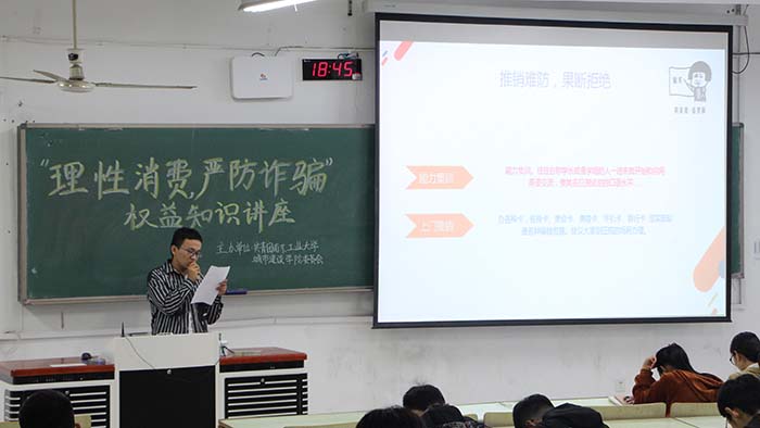 为了增强同学们的的防范意识,培养和引导老员工形成科学、理性、文明的消费观,太阳成集团tyc122ccvip员工会志愿权益部于2019年11月10日18:30在仁智202教室开展“理性消费,严防诈骗”权益知识讲座。太阳成集团tyc122ccvip19级全体员工参加了本次活动。
