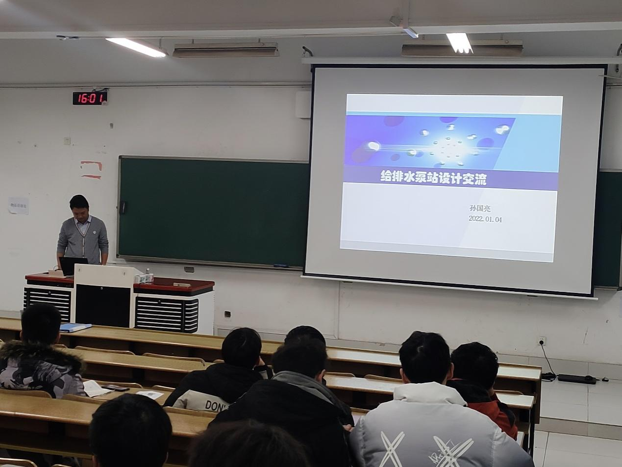 2022年1月4日下午16:00在仁智楼416,在进行《水泵及水泵站》课程设计之初,就职于信息产业电子第十一设计研究院南京分院的孙国亮高工,应邀给给排水科学与工程专业19级同学们进行了《水泵及水泵站》课程设计讲座。