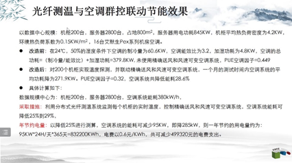 由于温湿度传感器随着时间的推移,精度无法达到要求,杨总团队测试了光纤测温的性能,发现其可以很好地避免温度传感器的缺点。经过比较光纤测温与空调群控联动的数据发现,采用分布式光纤测温系统监测每个机柜的实时温度,控制精确送风和风速可变空调系统,可将空调能耗降低到29%,可减少499320元的电费支出。