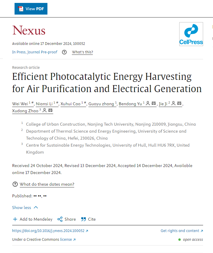 近日,我院余本东教授课题组在 Cell 子刊《Nexus》上发表题为“Efficient Photocatalytic Energy Harvesting for Air Purification and Electrical Generation”的研究论文(https://doi.org/10.1016/j.ynexs.2024.100052),我院魏巍(硕士)、李念思老师和曹旭慧(硕士)为共同第一作者,我院余本东教授、中国科学技术大学季杰教授和英国皇家工程院院士赵旭东教授为共同通讯作者。